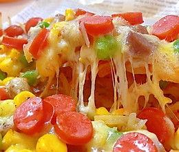 2. 香肠披萨:披萨酱、香肠、洋葱、青椒、马苏里拉奶酪。